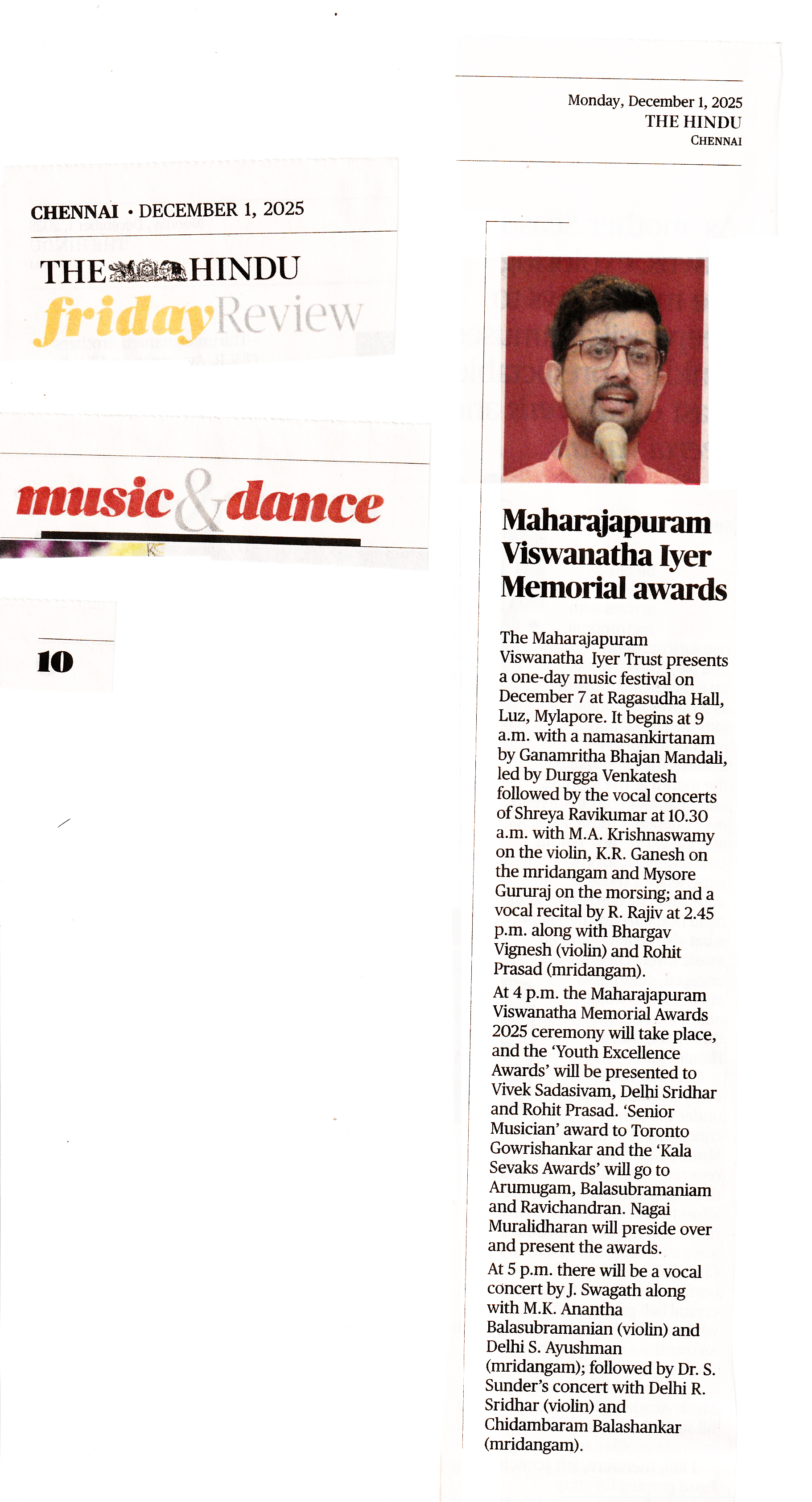 The Hindu Report Dated 1st December 2025 - MV Iyer Trust - ONE-DAY Music Festival & Memorial Awards Function ... more